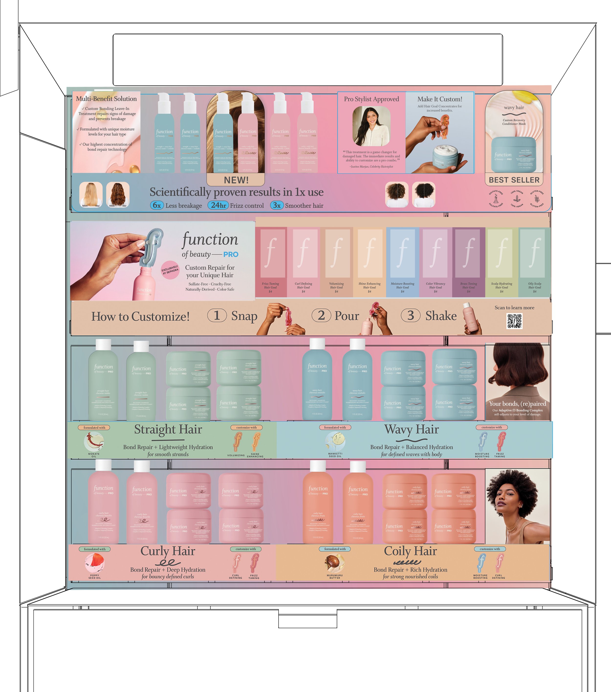 Visual merchandising and package designs for Function of Beauty PRO’s Sephora exclusive line. The new visual merchandising highlights each product’s unique ingredient story and the launch of the custom Leave-In Treatment.
