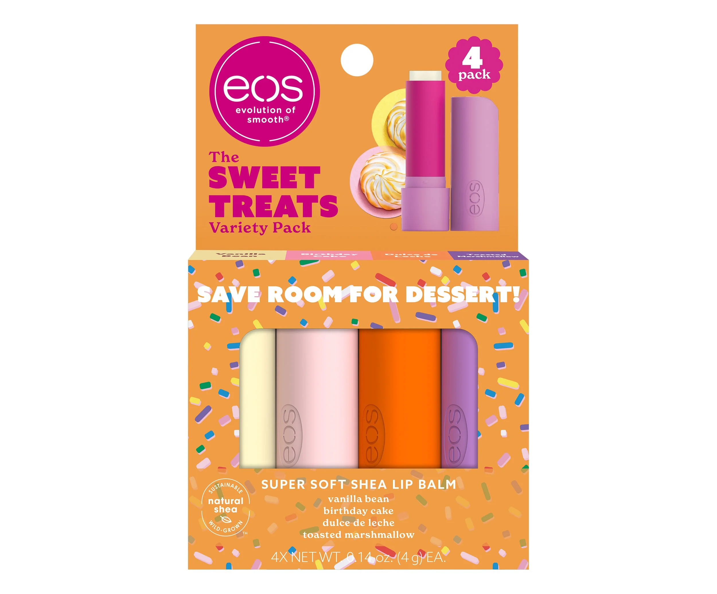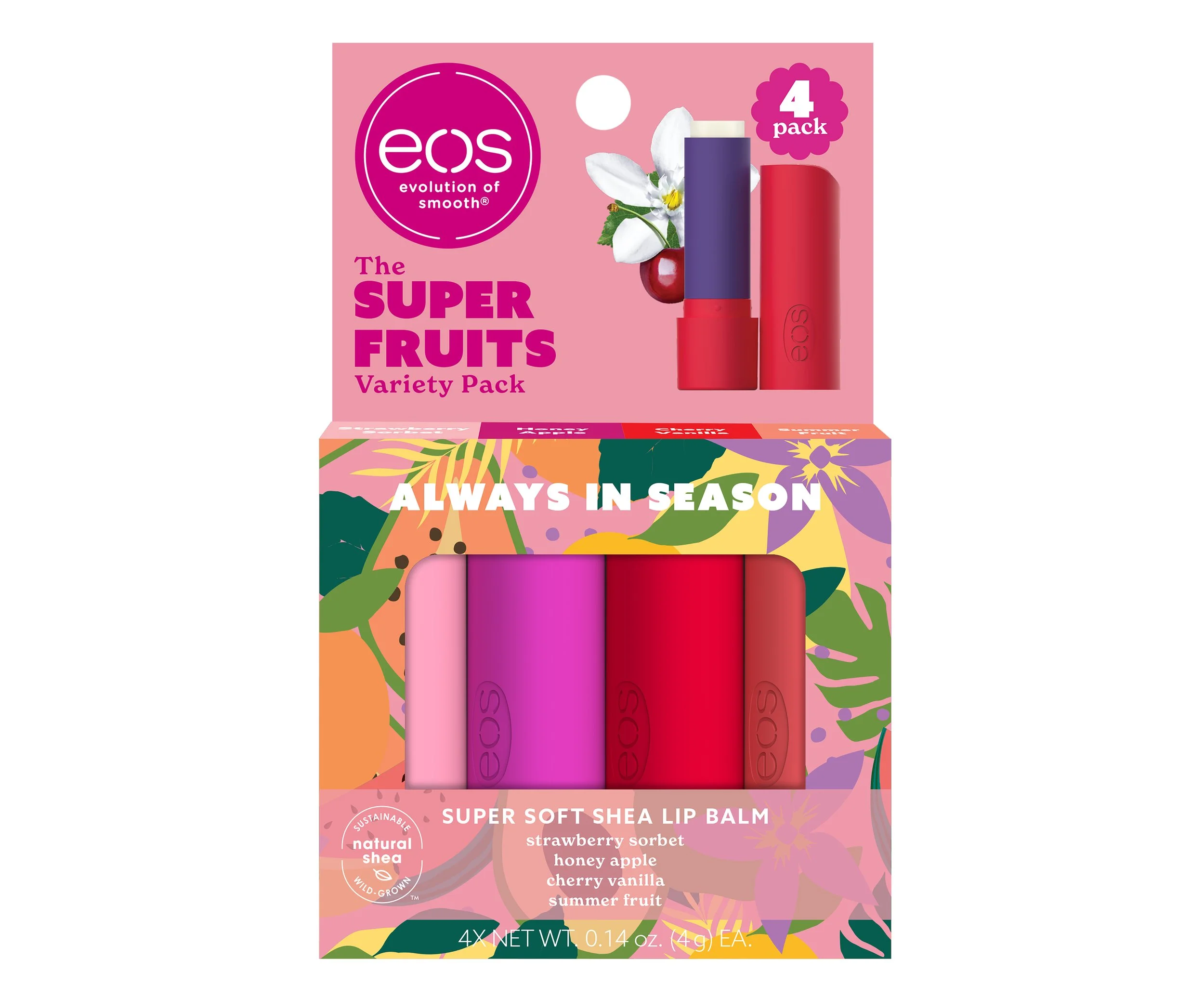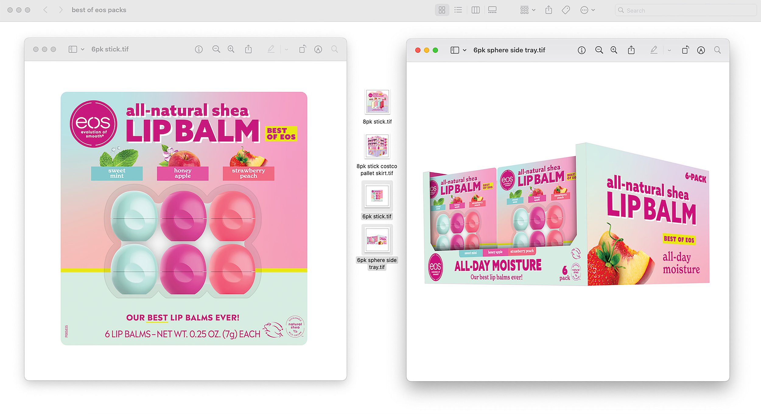 Package designs and visual merchandising for eos lip balm. These designs range from pattern-driven variety packs to tropical seasonal displays.
